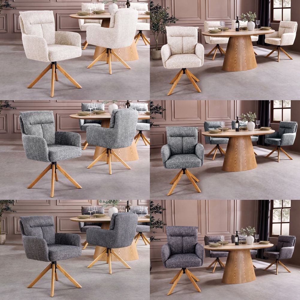 • 360° drehbarer Stuhl VALENTO Champagner-Greige Strukturstoff Eichenholz-Beine mit Armlehne
