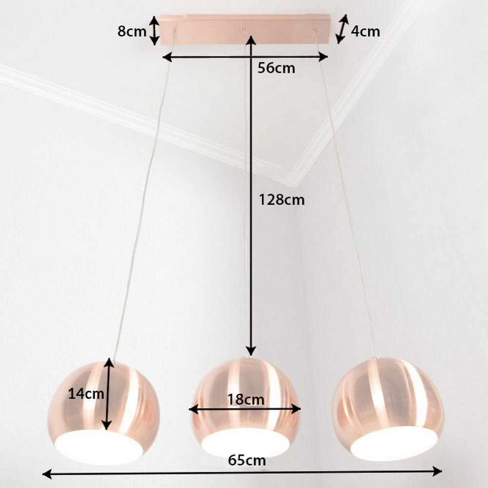 Exklusive 3er Set Hängelampe GLOBUS Kupfer mit 18cm Durchmesser je Kugel im stylischen und modernen Lounge-Design. Die Hängeleuchte GLOBUS Kupfer lässt Ihr Ambiente nicht nur hell erstrahlen sondern auch gemütlich erscheinen. GLOBUS ist das Schmuckstück eines jeden Raumes, Ihre Freunde und Gäste werden Sie beneiden. Rücken Sie Ihre Möbel in ein neues Licht und nutzen Sie die sanfte und gemütliche Atmosphäre von der Deckenlampe GLOBUS. Setzen Sie Ihr Wohnzimmer bzw. Esszimmer individuell in Szene und entscheiden Sie sich für diese wunderschöne Design Leuchte.