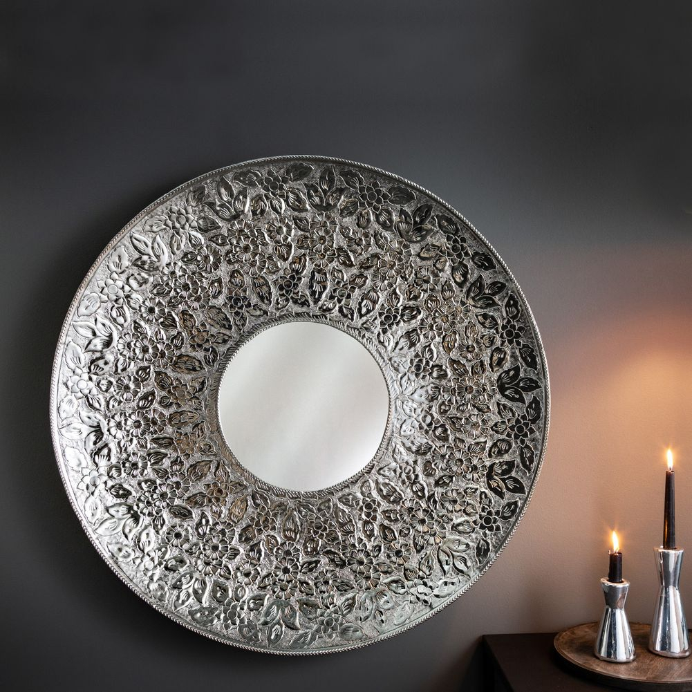 - Wandspiegel GARA Silber aus Aluminium im Blumen-Design handgefertigt 82cm Ø
