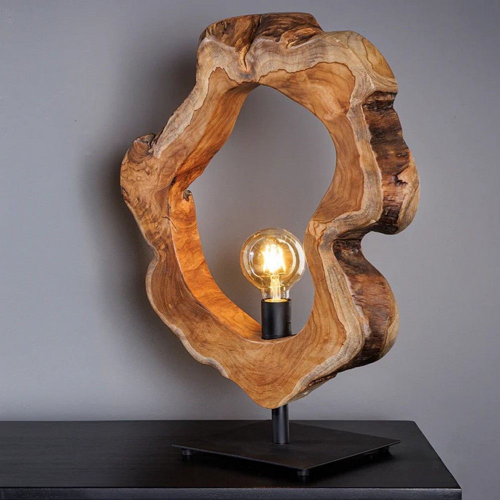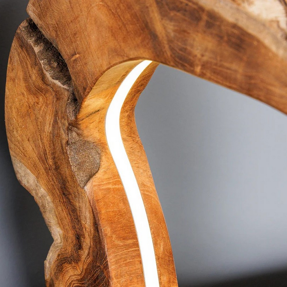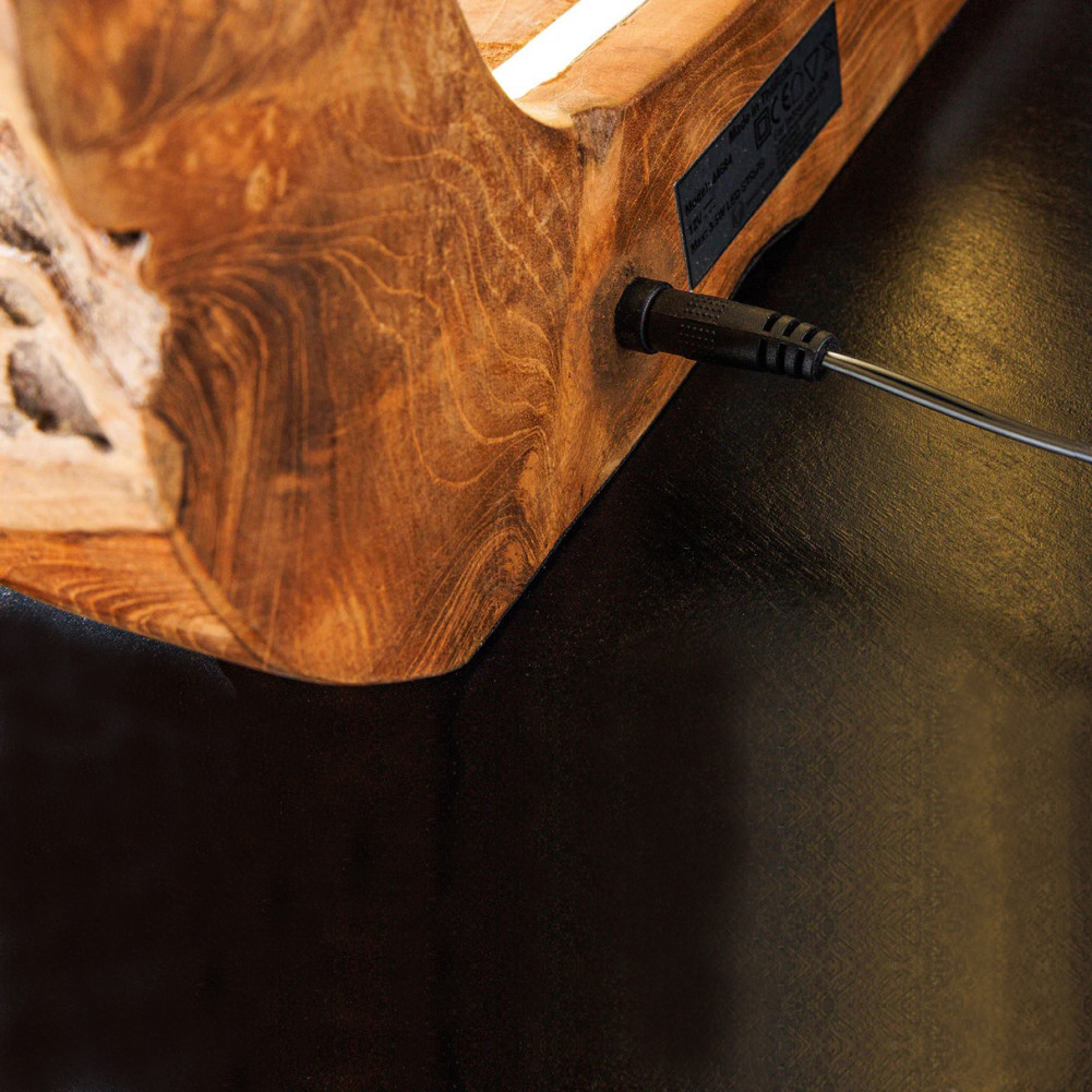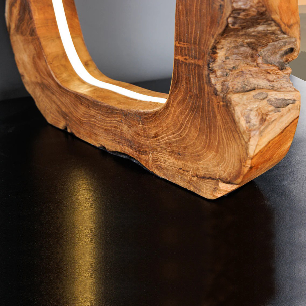 Jede Tischleuchte besticht durch ihr außergewöhnliches Design, das die natürliche Maserung und charakteristischen Holzstrukturen des organisch geformten Teakholzrahmens betont. Der integrierte Lichtstreifen setzt den Holzrahmen stimmungsvoll in Szene und erzeugt eine indirekte, blendfreie Beleuchtung. Die TALANG ist mehr als nur eine Lampe – sie ist eine exklusive Einzelanfertigung, die Funktionalität und Ästhetik perfekt vereint.