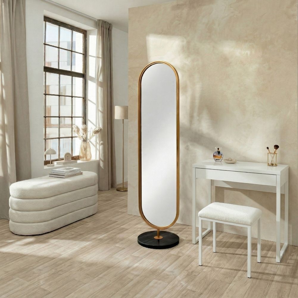 Der Standspiegel IMPERIA vereint zeitlose Eleganz mit modernem Design und wird zum exklusiven Blickfang in jedem Wohnraum. Mit seiner imposanten Höhe von 172cm und der schlanken ovalen Form sorgt er für eine stilvolle Präsenz, vergrößert optisch den Raum und bringt mehr Licht und Tiefe in Ihr Zuhause. Der edle goldfarbene Rahmen aus hochwertigem Eisen harmoniert perfekt mit dem massiven schwarzen Marmorsockel und steht für Stabilität, Langlebigkeit und luxuriöse Wohnästhetik.